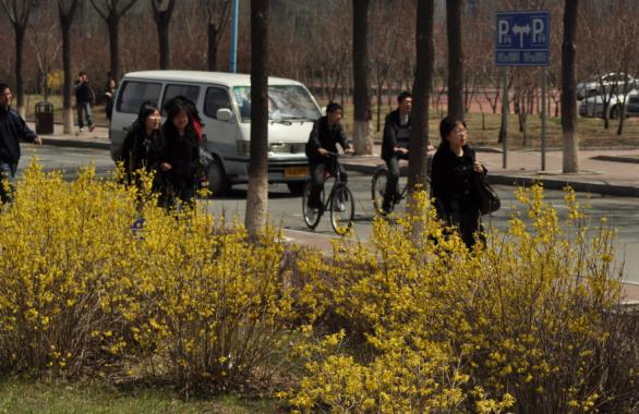 书上说,迎春花属木樨科素馨属的落叶灌木,别名金腰带、黄素馨、金梅、小黄花,花冠5—6裂片,具清香。但是吉大的迎春花都是4个花瓣的,除了植物那种淡淡的清香外没有特别的味道。所以即使满园黄花,我们也没有溺在花香中的感觉。这是迎春花值得人赞美的地方。百花未至,迎春先行,但是它并不因此炫耀自己报春的功绩,反而踏实低调地坚守自己的岗位,任劳任怨地完成自己的职责。而且笔者在吉大看到迎春花,花蕾都是倒挂在枝头上的,花儿也是面朝着大地开放,仿佛那短暂的娇艳就是为了给大地母亲一个完美的微笑。笔者窃以为,在那九天玄宫之中,“五一劳动奖章获得者”的荣誉称号,迎春花仙子该是当之无愧的!